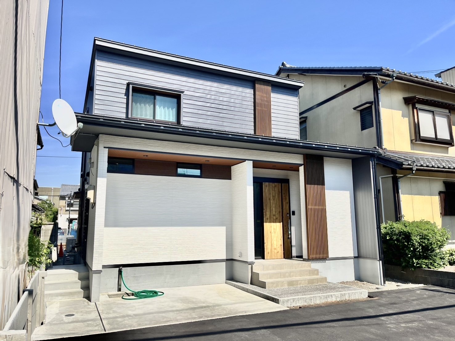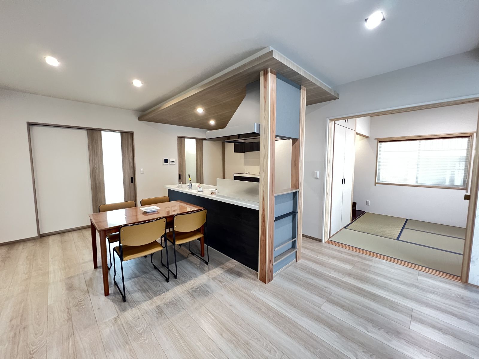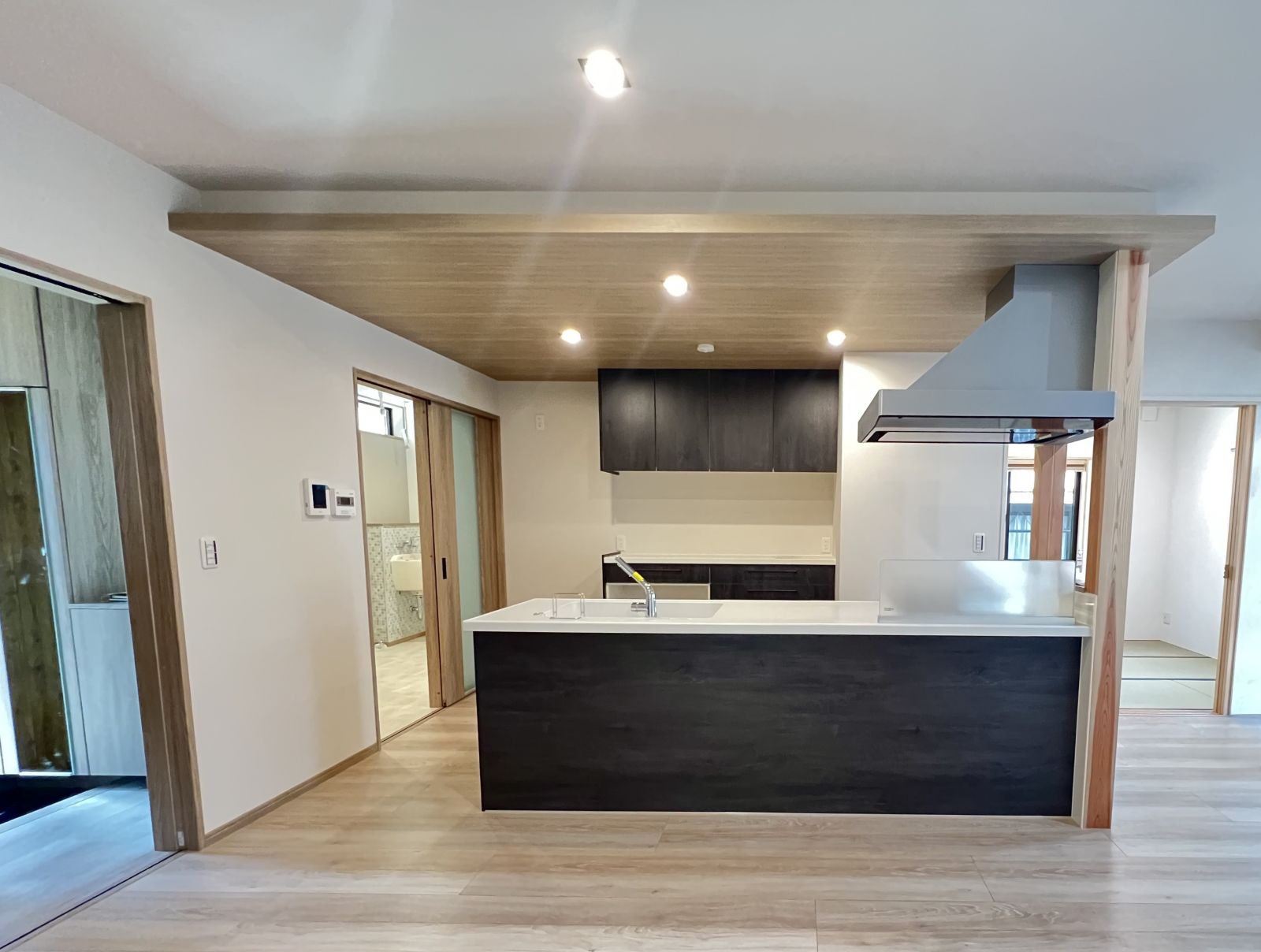 ダークグレーのキッチンが空間を引き締め、白と木目のインテリアが明るさと温もりを演出。下がり天井が空間にメリハリを生む。